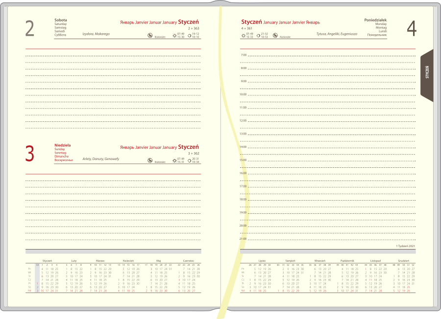 Układ: 1 dzień na 1 stronie, sobota i niedziela na 1 stronie, przed każdym miesiącem terminarz miesięczny